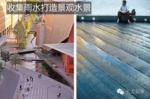 除了設(shè)于綠地的雨水管理措施,在硬質(zhì)地面可以通過(guò)透水鋪裝實(shí)現(xiàn)雨水滲透,或通過(guò)水渠和溝槽將雨水引流至街道附近的滯留設(shè)施中,凈化的雨水可以就地消化于水景觀中,打造互動(dòng)的親水景觀。