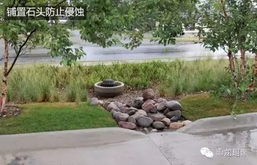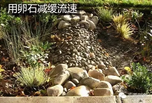 如果植草溝的豎向坡度較大超過(guò)4°,則應(yīng)設(shè)置消能坎減緩水流,可以根據(jù)風(fēng)格設(shè)計(jì)不同的消能坎。下圖中的消能坎為河中卵石鋪置而成。